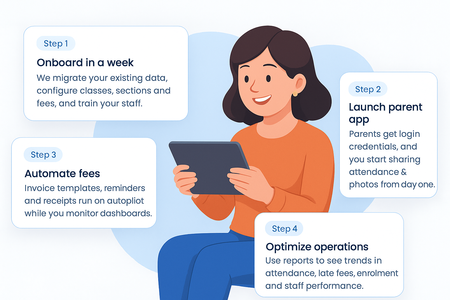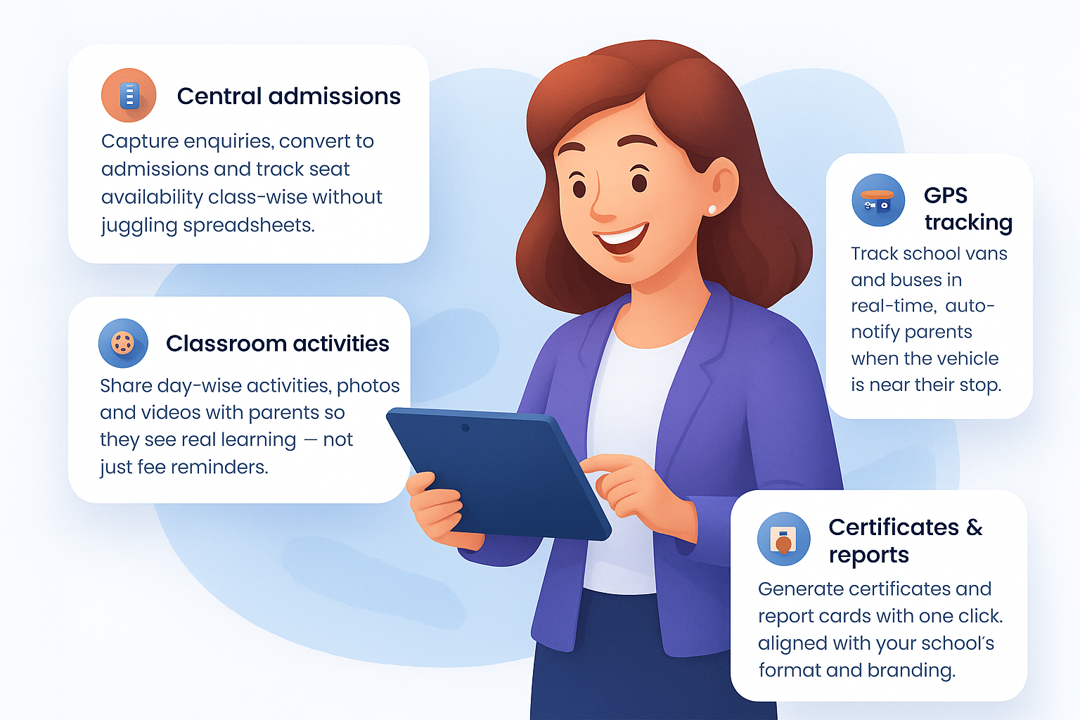- Increases enrolment and parent satisfaction through transparency and timely communication.